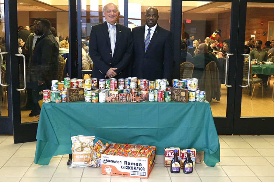 Photo Caption: Jim Jackson (left), Franklin County Emergency Food Pantry, partnered with Kentucky State University, for a Thanksgiving food drive. (Photo credit: Kentucky State University.)