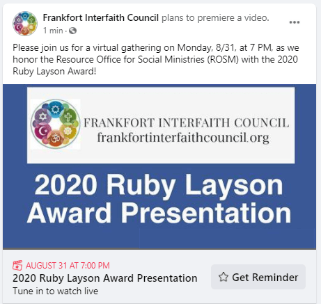 The event will take place as a facebook premiere. So be sure and tune into the Frankfort Interfaith Council’s facebook page at https://www.facebook.com/frankfortinterfaithcouncil a little before 7 PM on 8/31.